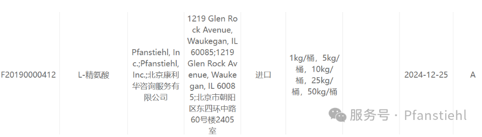 “ 熱烈祝賀Pfanstiehl品牌注射級精氨酸A-170 CDE注冊登記號F20190000412已激活!”Pfanstiehl新年喜訊頻傳,注射級精氨酸A-170 CDE登記號F20190000412激活了。Pfanstiehl品牌注射級精氨酸A-170,秉承一貫高品質(zhì)理念,具有超高純度,超低內(nèi)毒素,超低金屬殘留的特點,單獨檢測29種金屬離子,并且新增DNA,RNA,DNA酶,RNA酶和脂肪酶,亞硝酸鹽等多項質(zhì)量指標(biāo)的檢測,符合多國藥典規(guī)定(USP, EP, JPE, ChP),可用于生物治療性藥物和疫苗的生產(chǎn)。· 產(chǎn)品名稱: L-Arginine, High Purity, Low Endotoxin,