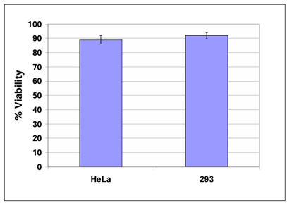 Fig 1?細(xì)胞活力檢測:按照實(shí)驗(yàn)方案回收HeLa和293細(xì)胞培養(yǎng)6天,用臺盼藍(lán)法測定細(xì)胞活力。